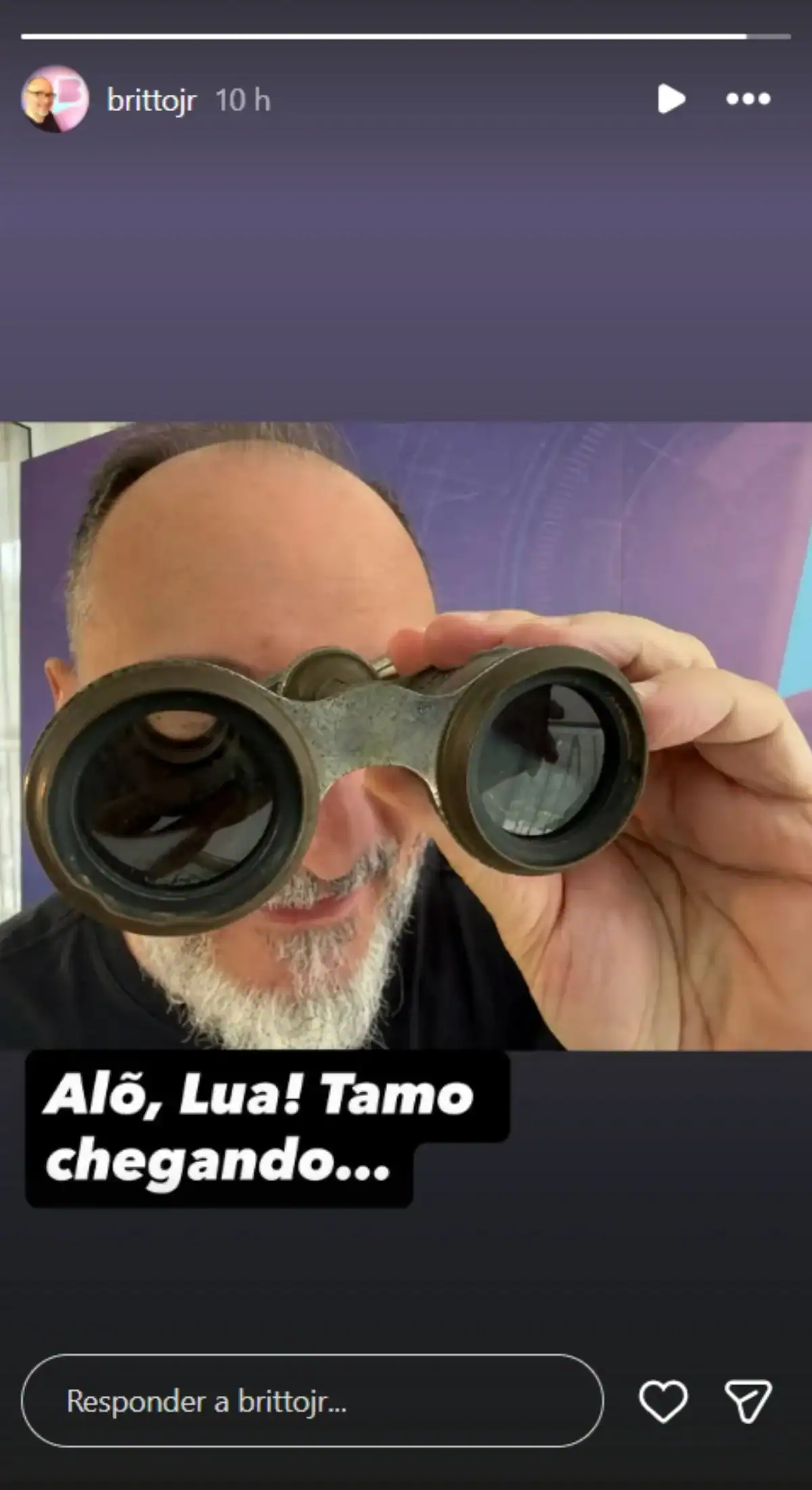 Britto Jr., por exemplo, chamou atenção ao publicar um story enigmático nas redes sociais nesta quinta-feira (2/4), em que aparece com um binóculo acompanhado da legenda “Alô, Lua! Tamo chegando”.