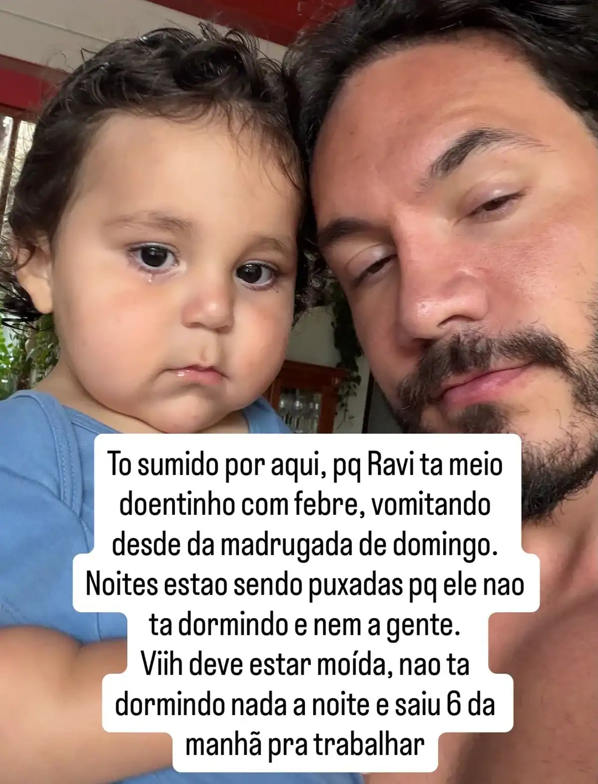 “Estou sumido por aqui porque o Ravi tá meio doentinho com febre, vomitando desde a madrugada de domingo. As noites estão sendo difíceis porque ele não está dormindo e nem a gente”, afirmou.