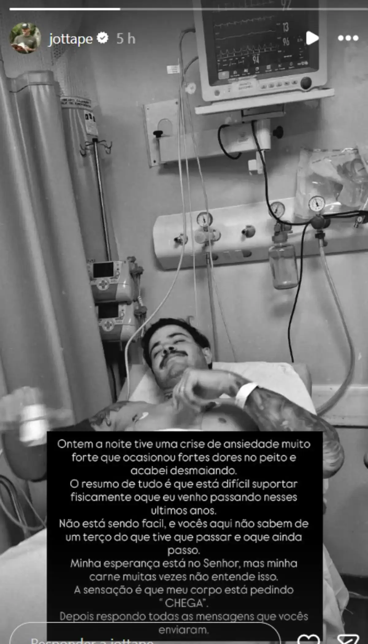 O cantor Jottapê foi internado nesta sexta-feira (10/4) após sofrer uma crise de ansiedade na noite anterior. Ele compartilhou em seus stories no Instagram uma imagem deitado em uma cama de hospital, indicando que está recebendo cuidados médicos.