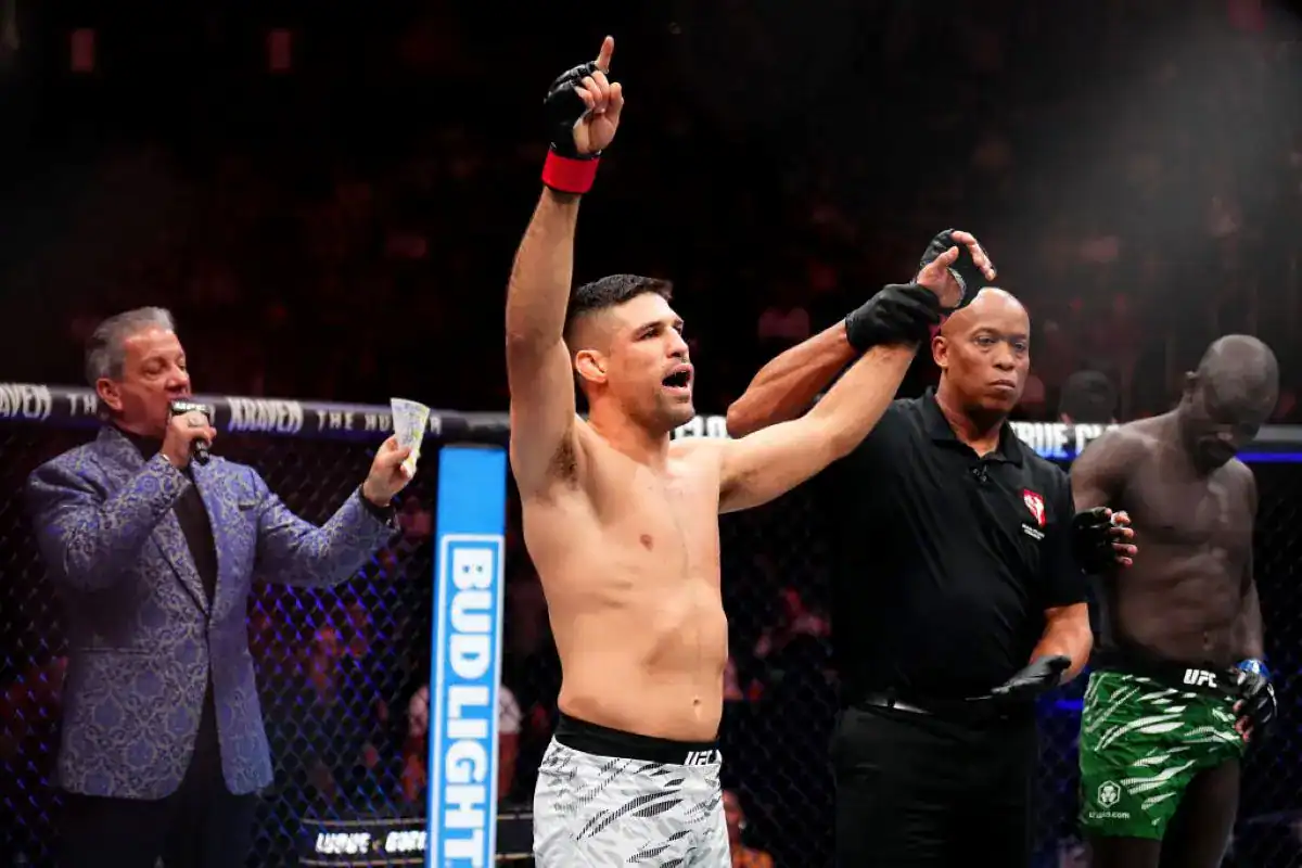 Vicente Luque ergue o braço no octógono antes da estreia no peso-médio do UFC 327 (Foto: Instagram)