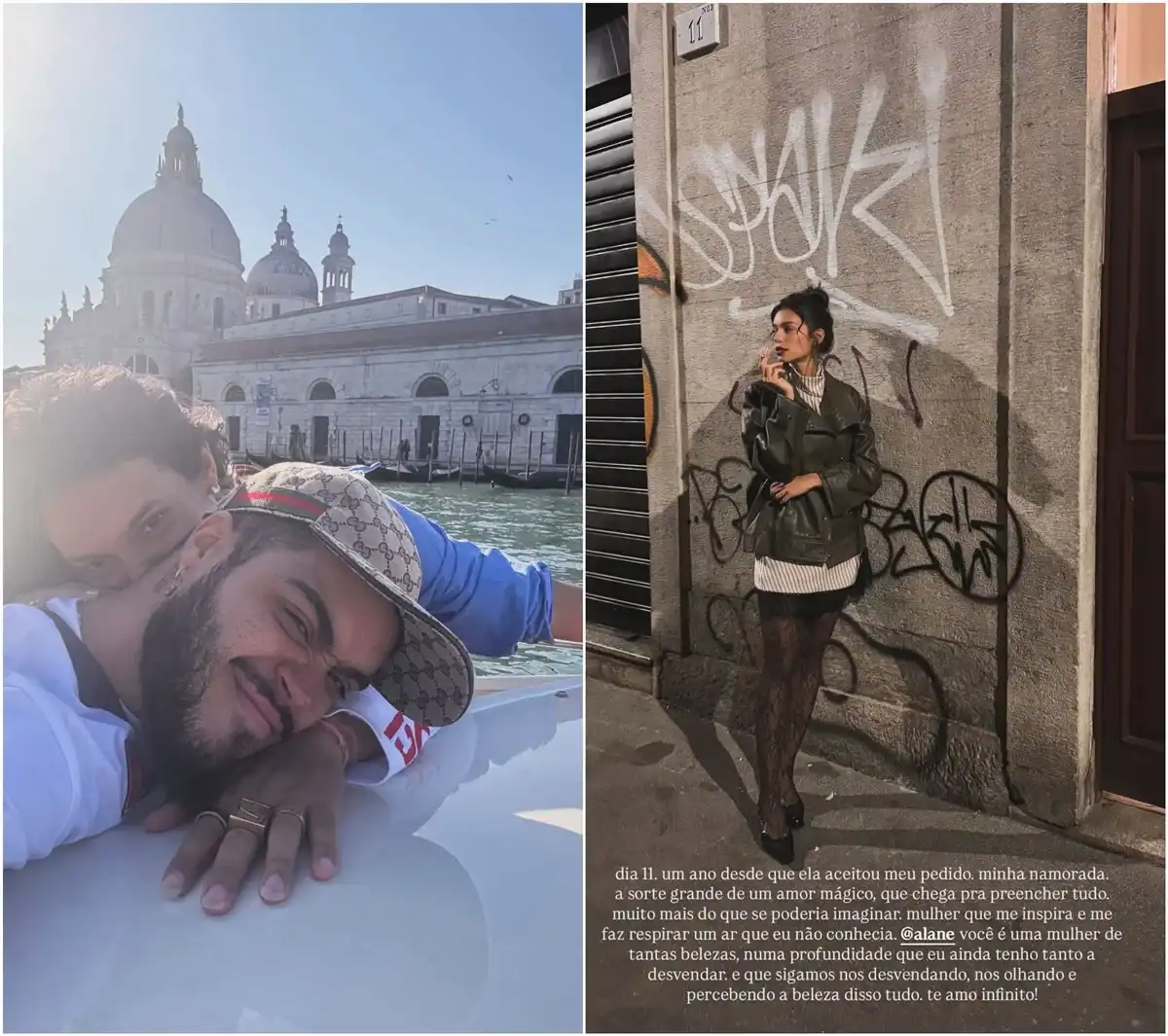 Ele continuou: “Mulher que me inspira e me faz respirar um ar que eu não conhecia. Alane, você é uma mulher de tantas belezas, numa profundidade que eu ainda tenho tanto a desvendar. E que sigamos nos desvendando, nos olhando e percebendo a beleza disso tudo. Te amo infinito!”, completou. Os rumores sobre o relacionamento entre o cantor e a ex-BBB24 começaram no Carnaval do ano passado, quando foram vistos juntos em uma viagem. Posteriormente, em abril e maio de 2025, foram flagrados juntos em outras ocasiões. A oficialização ocorreu no dia 25 de maio.