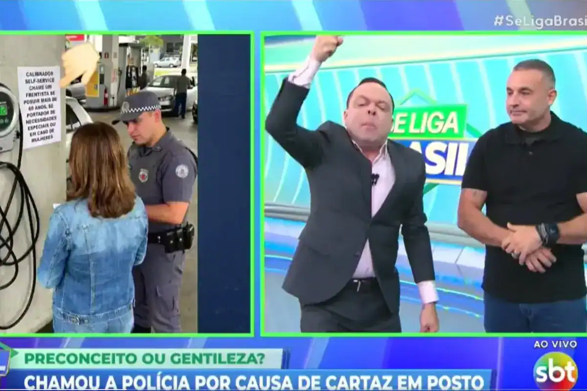 “Ela interpretou que o cartaz transmite uma mensagem misógina, que é o preconceito contra mulheres (…) Ela viu esse cartaz e ficou indignada. Ela disse: ‘Que absurdo é esse? Este posto está promovendo a misoginia’. Todos foram parar na delegacia”, relatou o apresentador.
