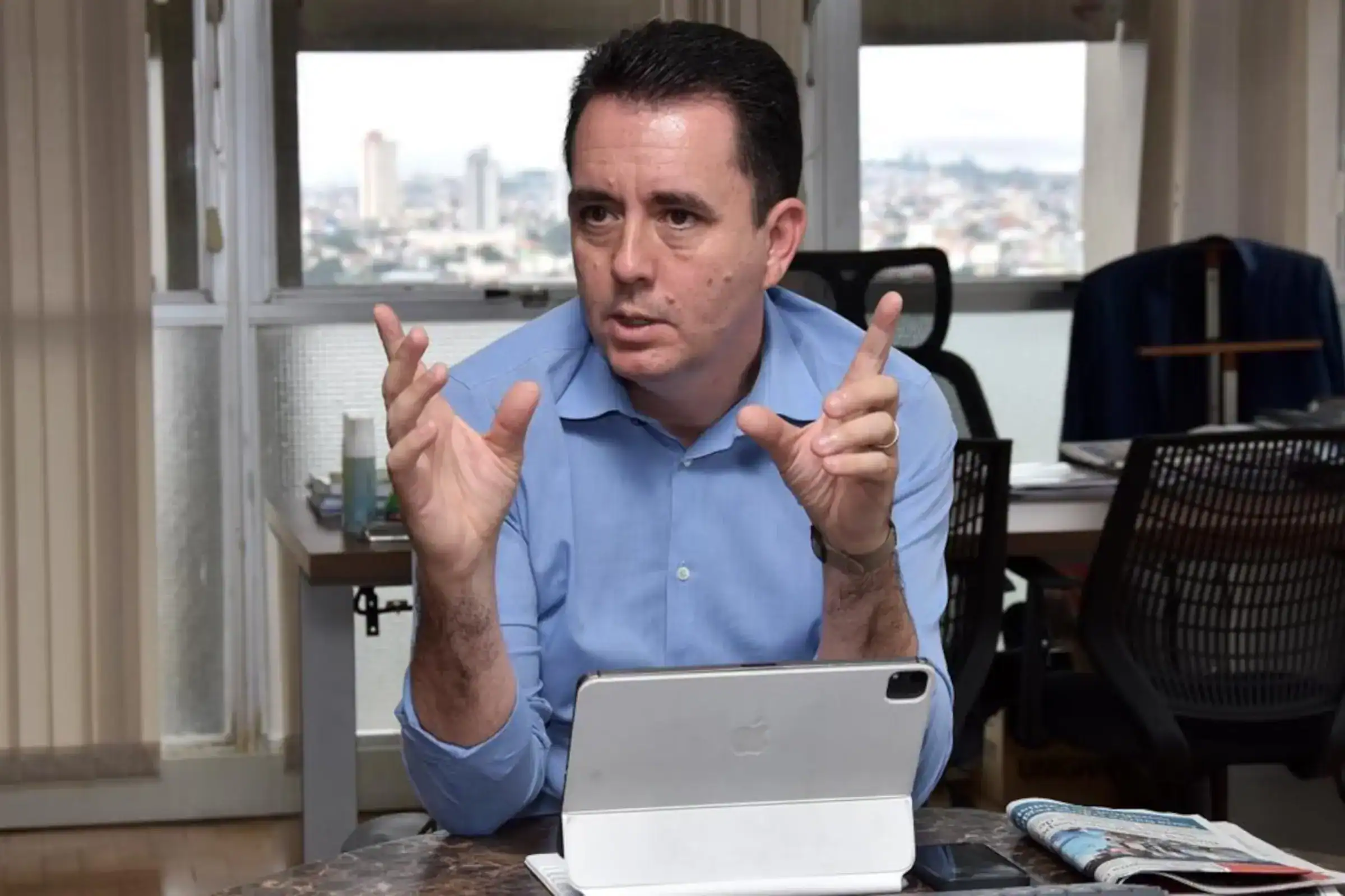 Paulo Serra em seu escritório durante entrevista sobre a candidatura ao governo de SP. (Foto: Instagram)