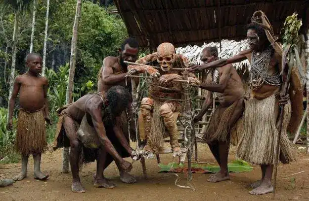A tribo Fore, de Papua-Nova Guiné, ficou conhecida por praticar canibalismo ritual até a década de 1950, consumindo corpos de familiares mortos como forma de respeito e luto. O costume, no entanto, esteve diretamente ligado ao surgimento de uma doença fatal chamada kuru, que atingiu principalmente mulheres, crianças e idosos da comunidade.