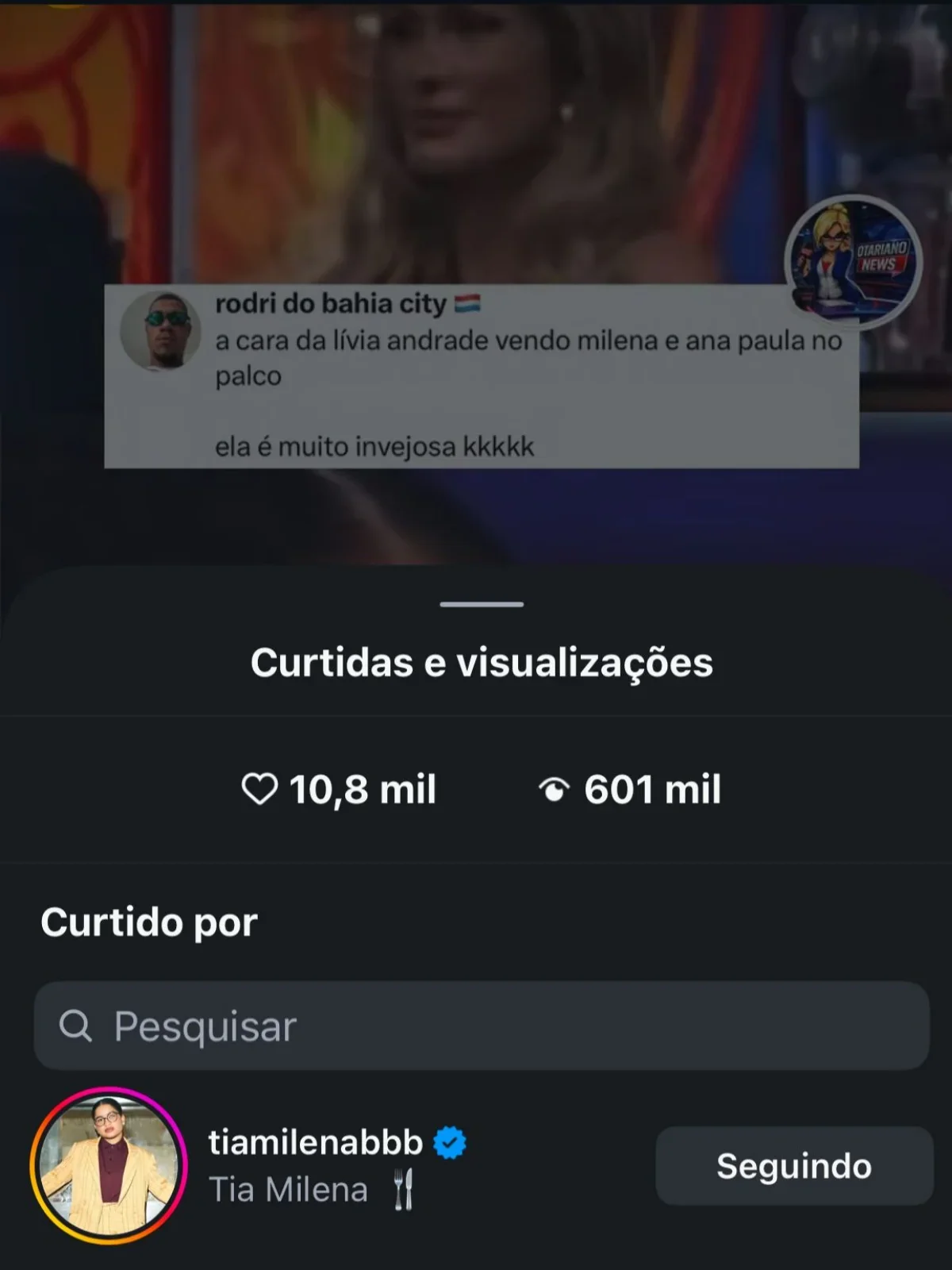 > “A cara da Lívia Andrade vendo a Milena e a Ana Paula no palco, ela é muito invejosa”, dizia o post que recebeu o like da ex-BBB.
