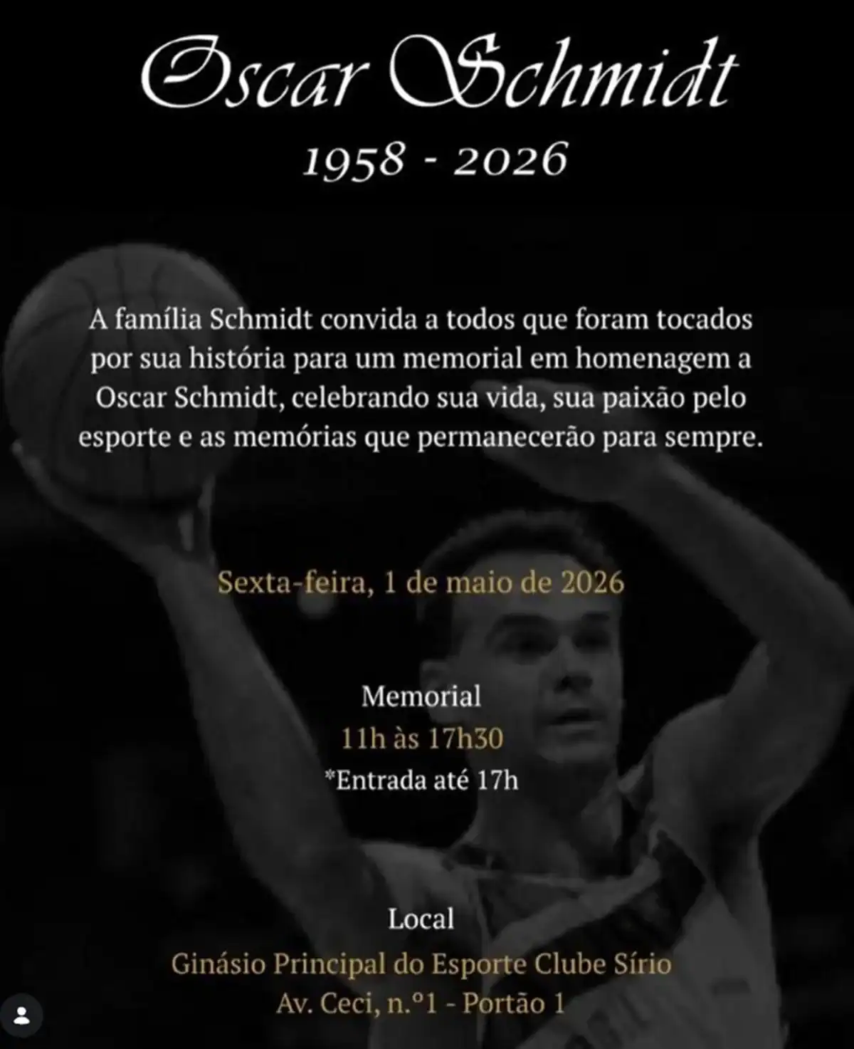 A família do ex-jogador de basquete Oscar Schmidt organizou um evento para que os fãs do esporte possam se despedir do eterno Mão Santa. Na sexta-feira (1º/5), o Clube Sírio, em São Paulo, abrirá um memorial para visitação pública, permitindo que os brasileiros relembrem momentos de um dos maiores atletas do país.