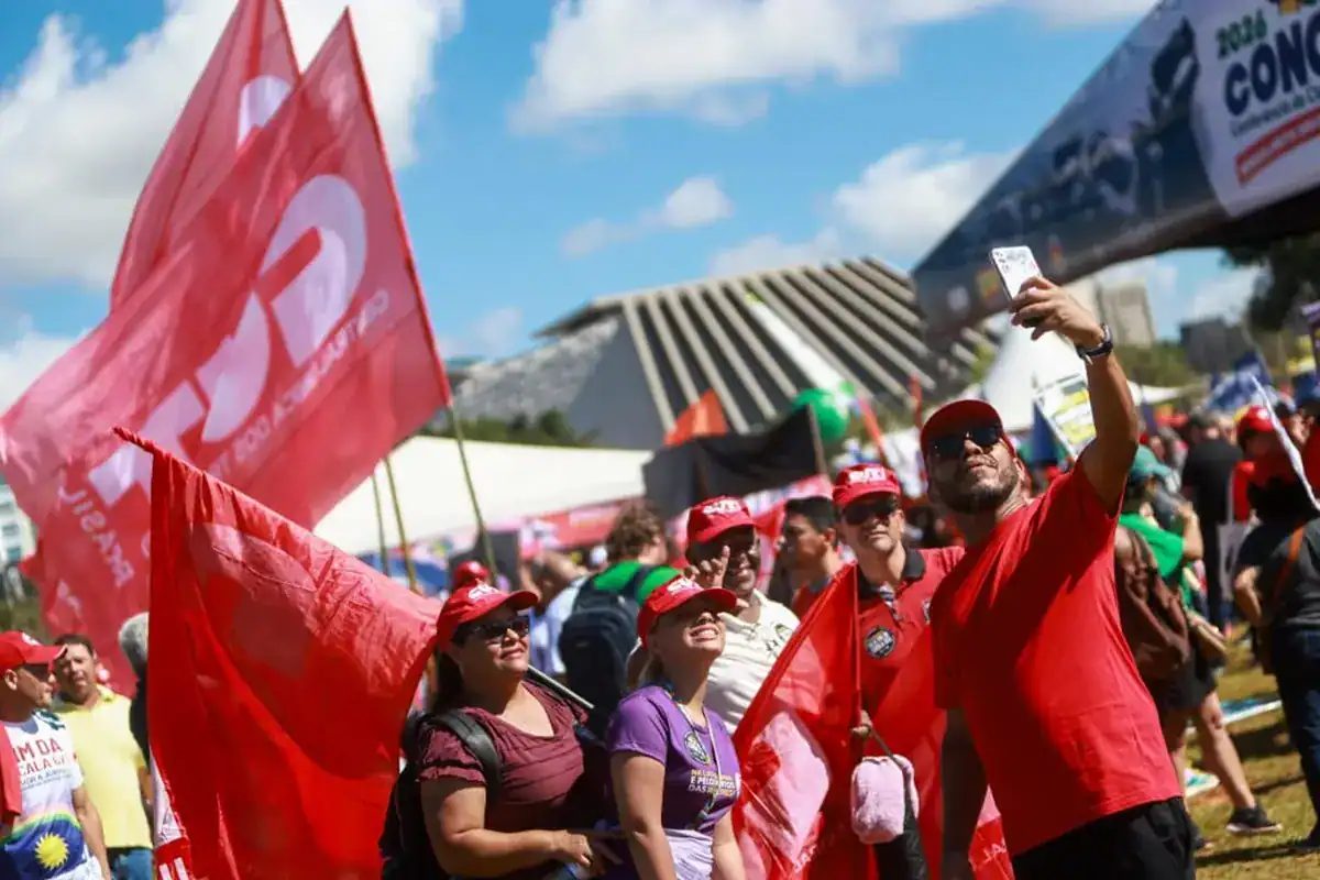 Manifestantes com bandeiras vermelhas da CUT em ato pró-redução da jornada diante do Congresso Nacional (Foto: Instagram)