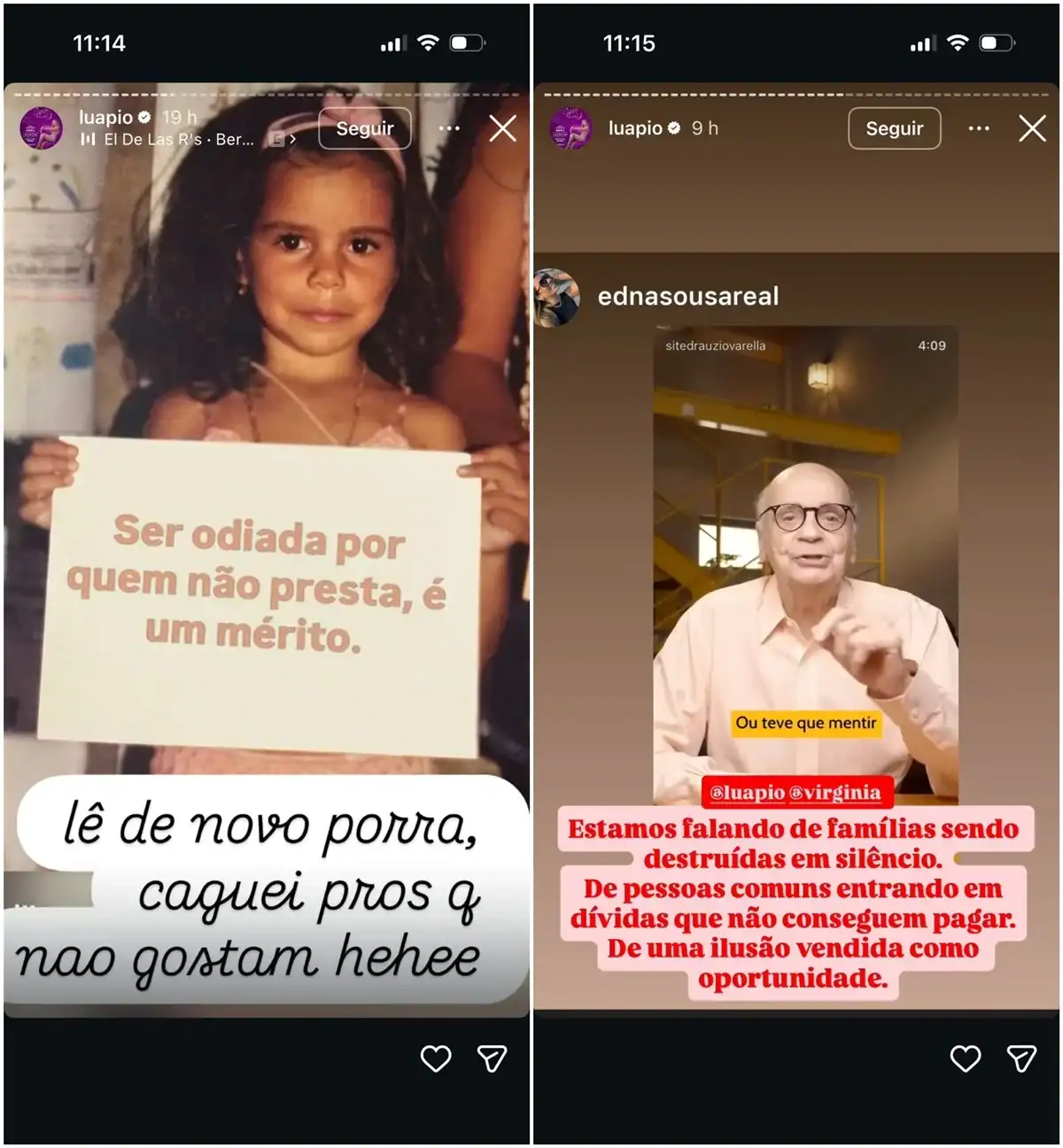 Após a polêmica com Virginia ganhar repercussão, Luana retornou às redes sociais e ironizou a situação. “Ser odiada por quem não presta é um mérito”, dizia a imagem compartilhada por Luana Piovani, que completou escrevendo: “Lê de novo porra, caguei pros que não gostam”.