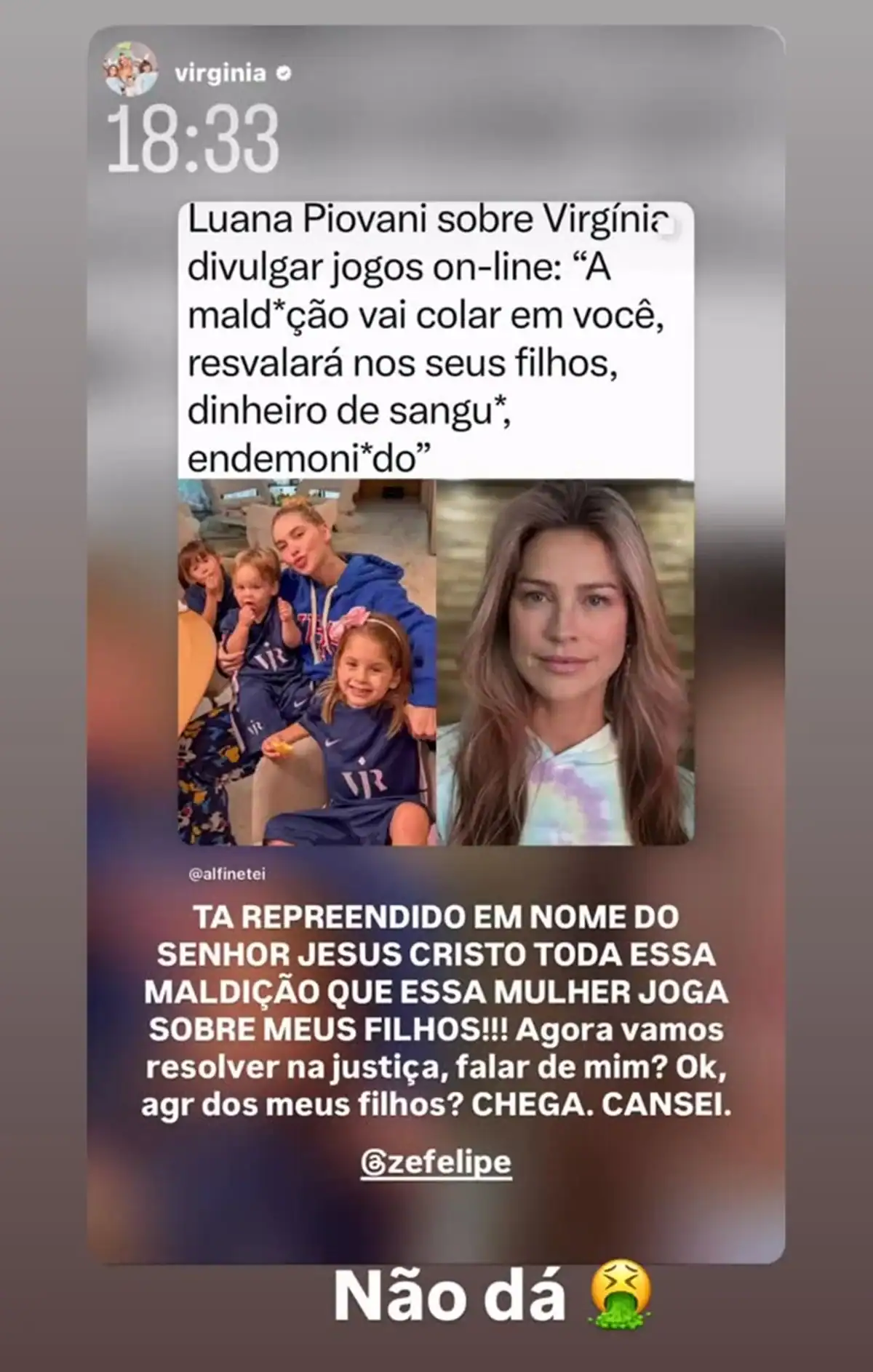Ao expor o sofrimento de Juliana, Luana Piovani citou Virginia Fonseca e escreveu: “Virginia, a maldição vai colar em você! Resvalará nos seus filhos, dinheiro de sangue, endemoniado”, criticou a artista.