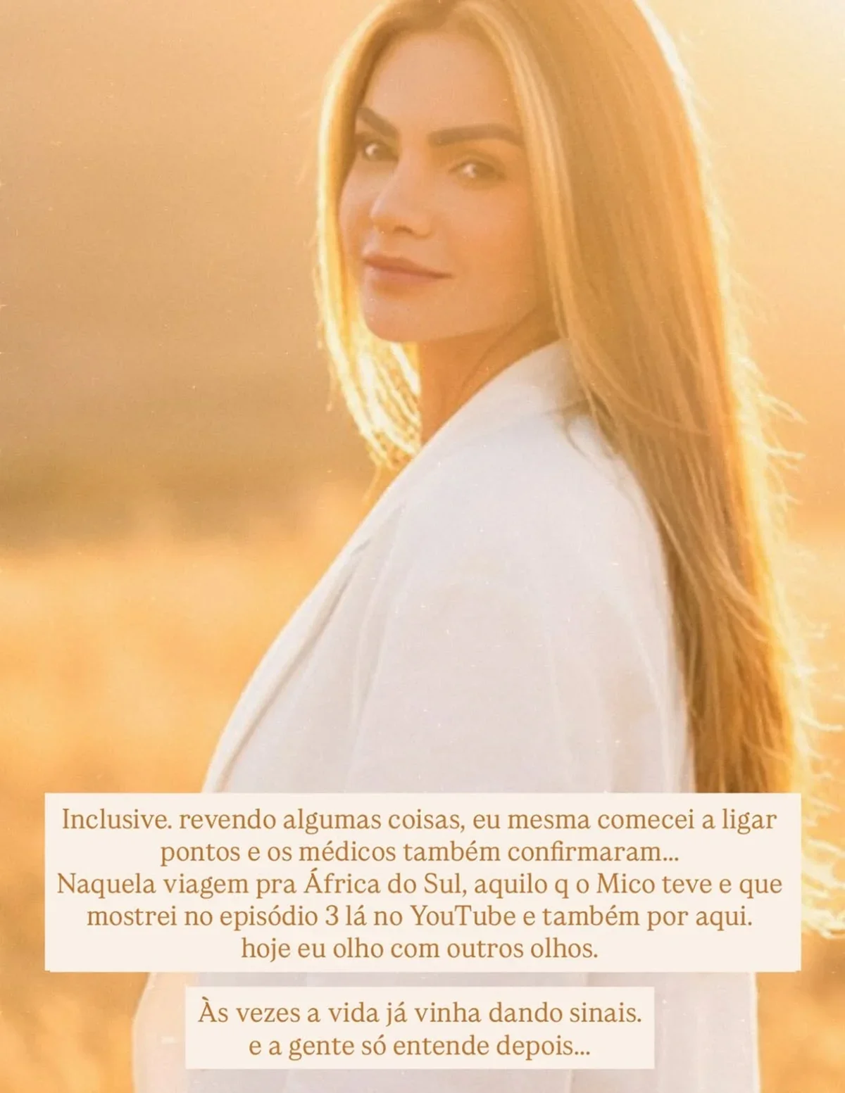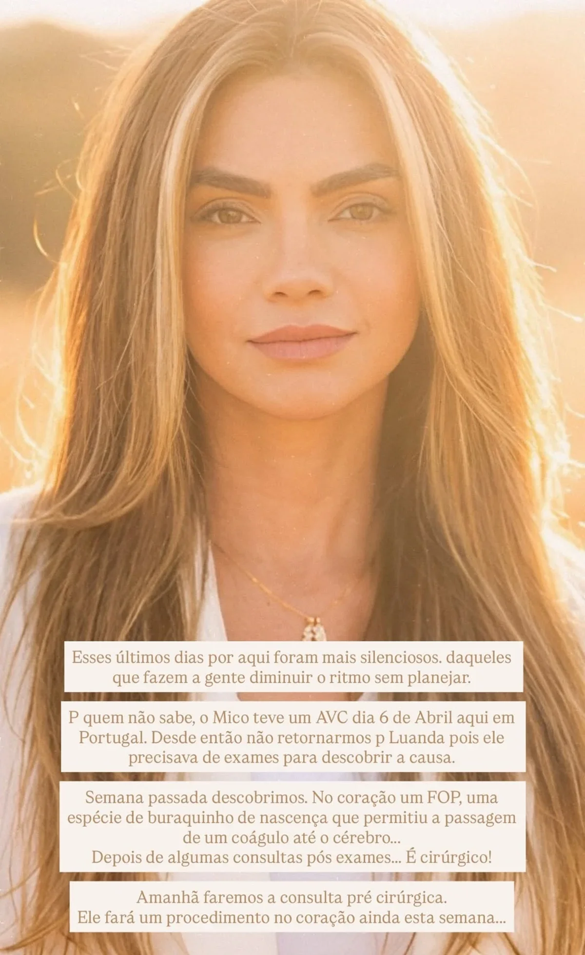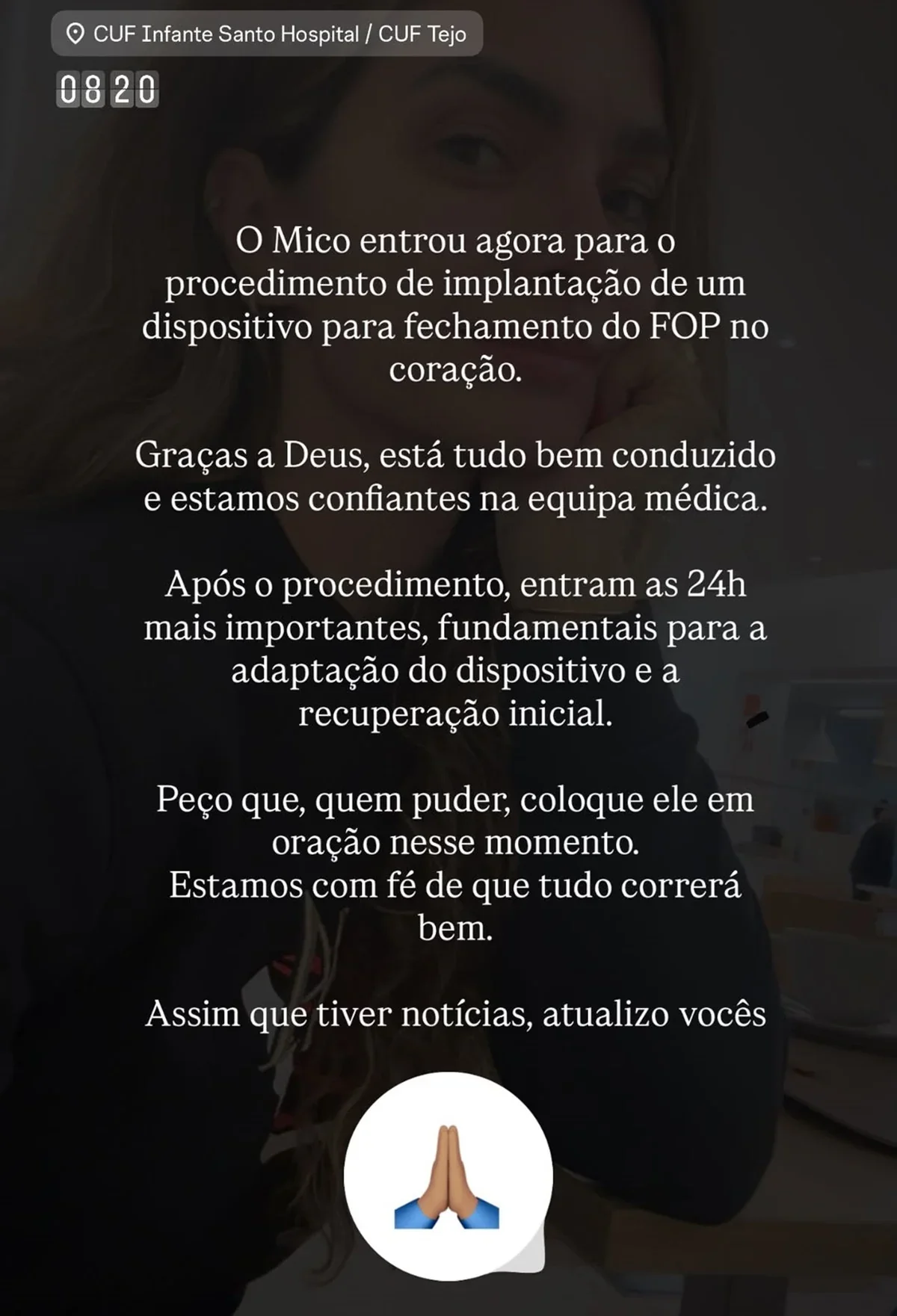 Horas antes, Kelly Key já tinha dado detalhes da operação: “O Mico entrou agora para o procedimento de implantação de um dispositivo para fechamento do FOP no coração. Graças a Deus, está tudo bem conduzido e estamos confiantes na equipe médica”, começou.