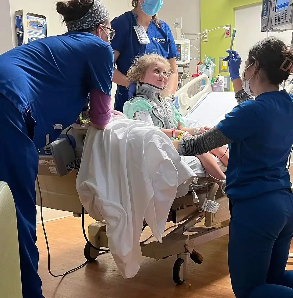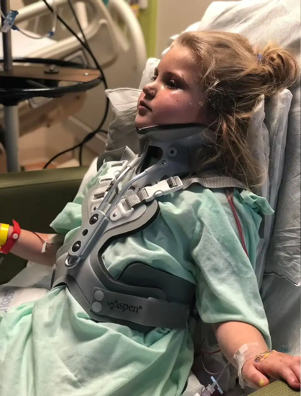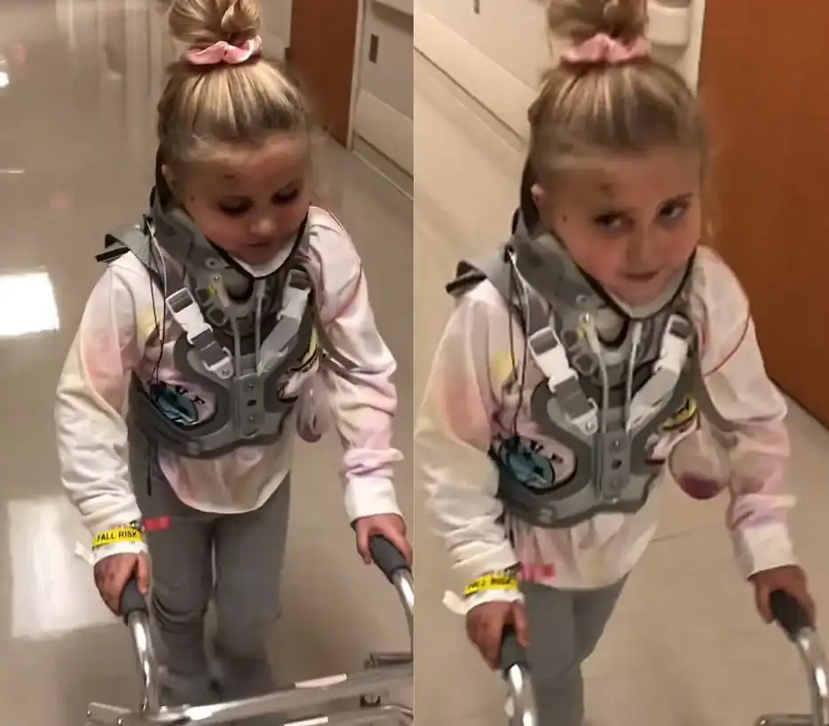 Após a cirurgia para tratar uma fratura em uma vértebra, a menina iniciou a reabilitação e foi registrada caminhando com andador pelos corredores do hospital. Em um dos momentos, disse: “O chão está meio escorregadio”, enquanto era incentivada pela avó.